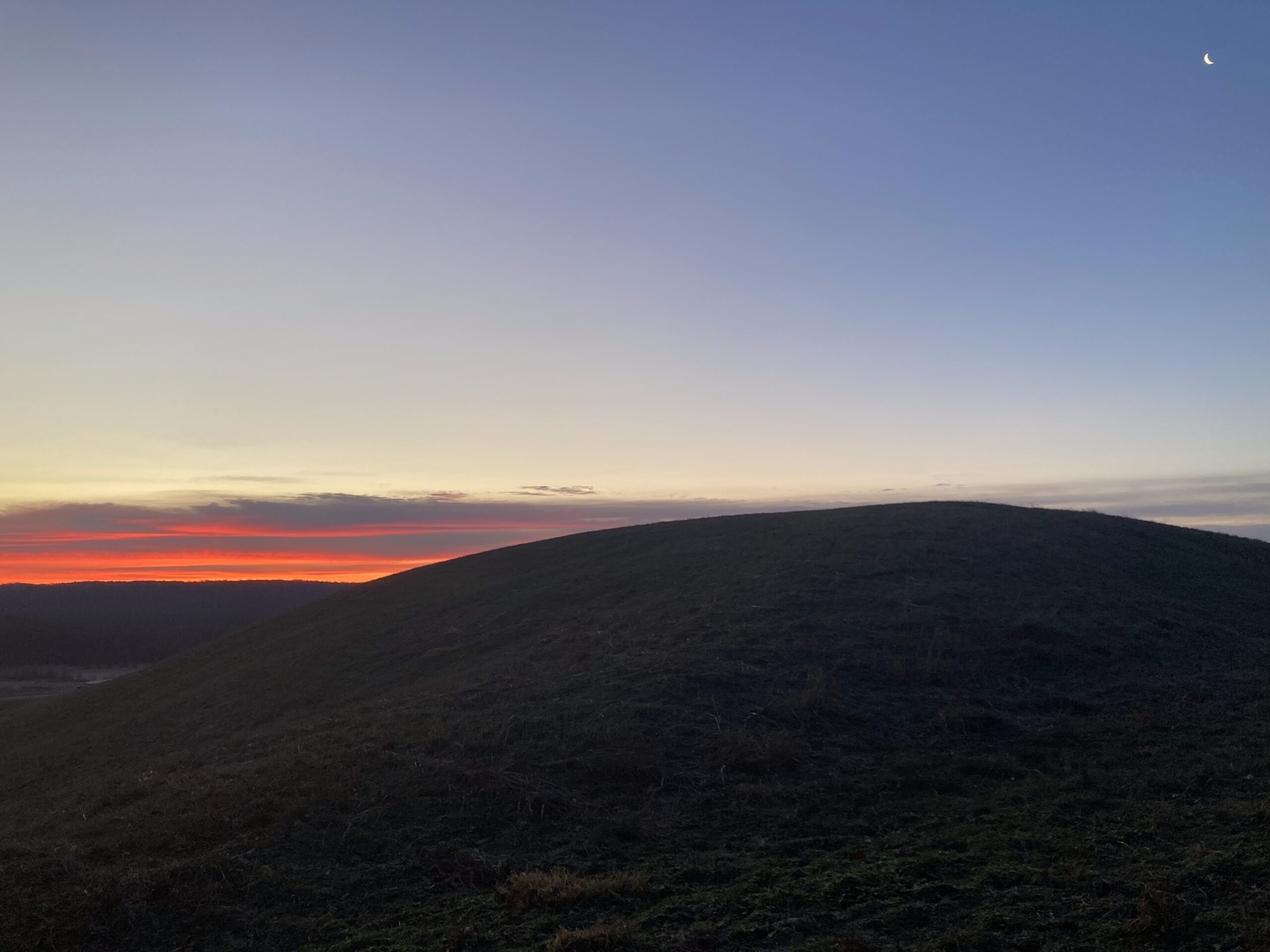 Your answer is a slow walk through the woods, then the exertion up toward a clearing where all around will be the firey sky. The crescent moon, lofty and wise, watches you like a hawk tracking mice. Your small form charting a line out and up the grassy hill until it stops, a shadow now, standing reverent before a quiet land ablaze in beauty. If there is anything that reminds you of the humility of miracles, it is the sun’s daily return.